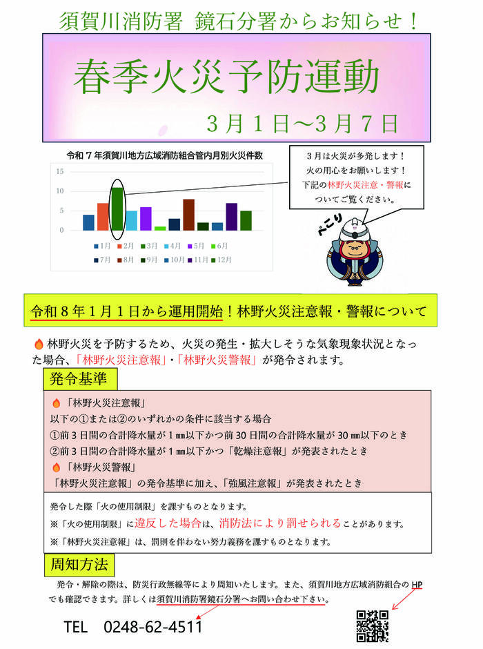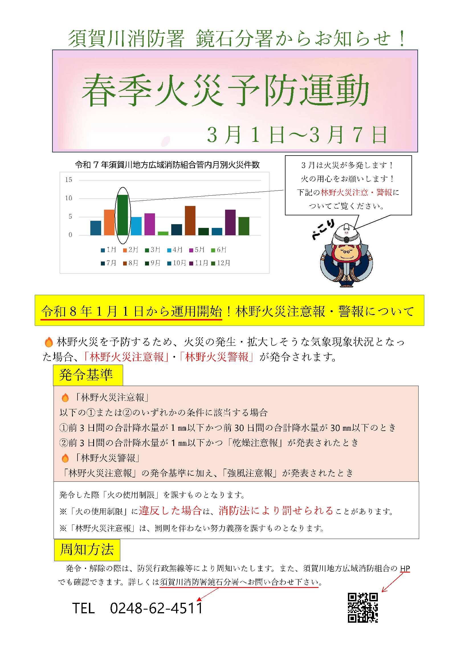 毎年3月1日から3月7日までの間を「春季火災予防運動週間」と定め、火災への注意を重点的に呼びかけています。