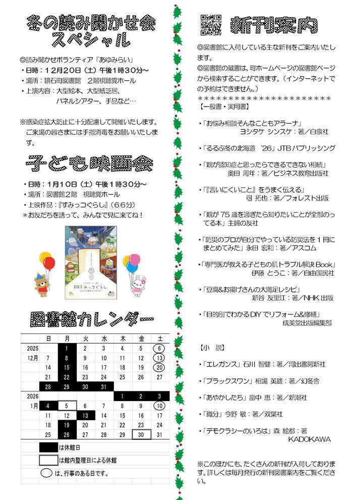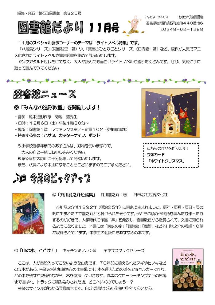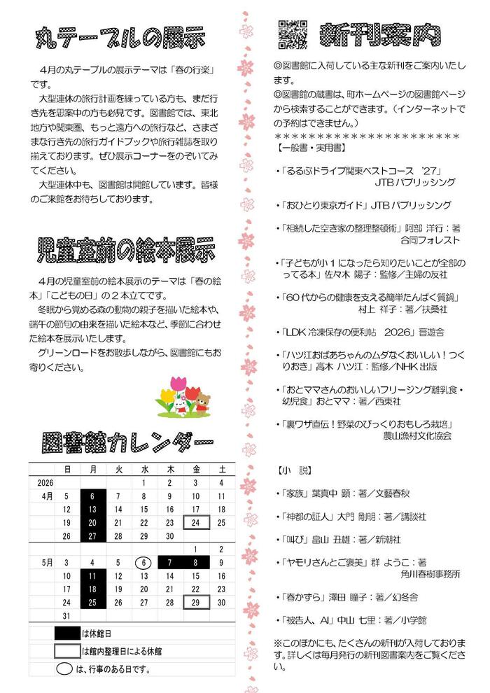 今後の感染症の状況によって、図書館サービスに変更が生じた場合は、「今月の図書館からのお知らせ」ページにてお知らせいたします。
