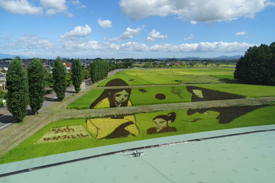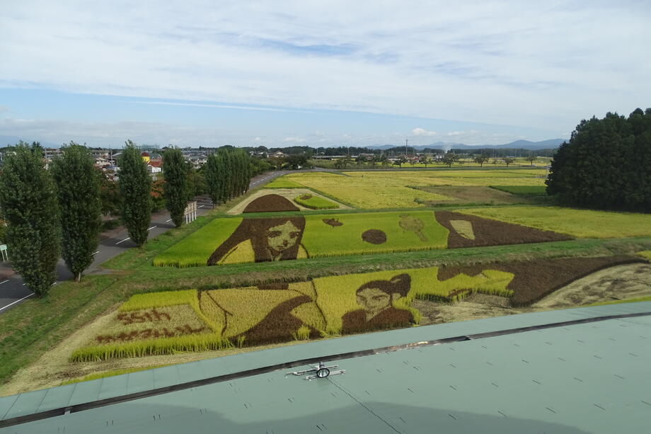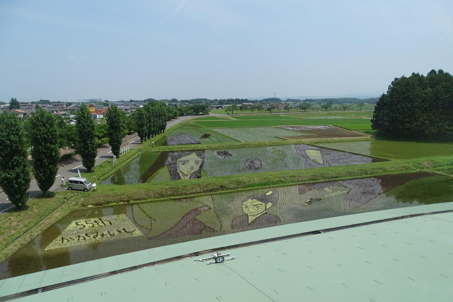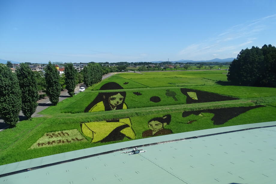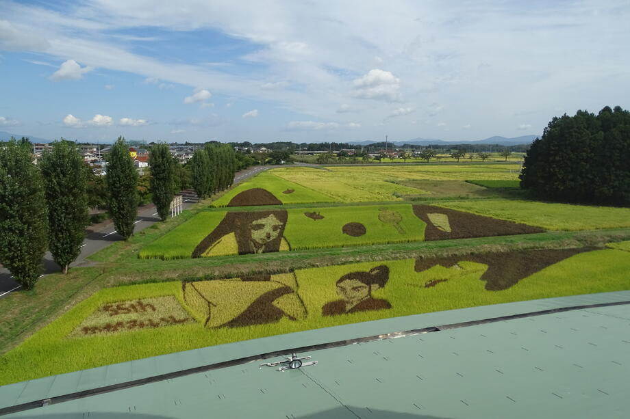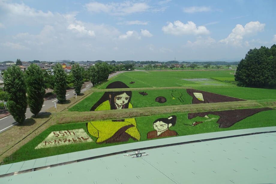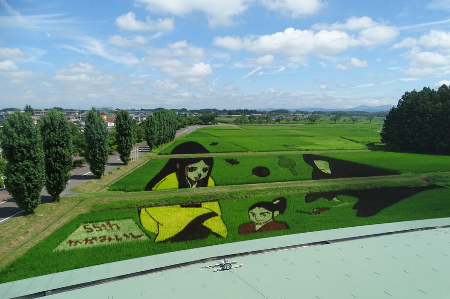 観覧場所から丁度よく見えるように遠近法を用いていることも、かがみいし田んぼアートの特徴です。