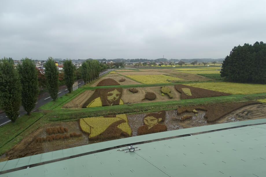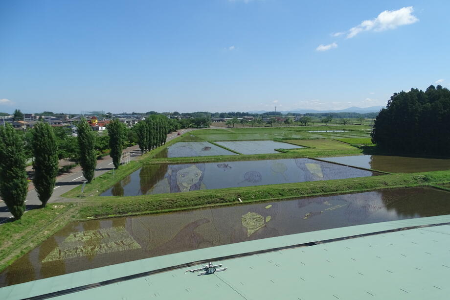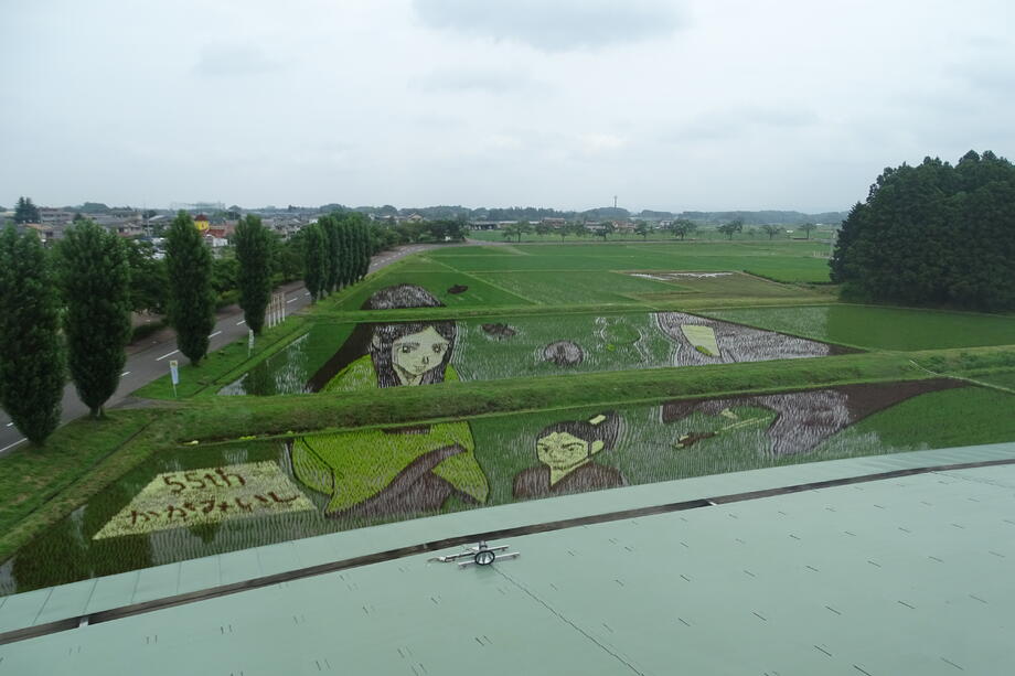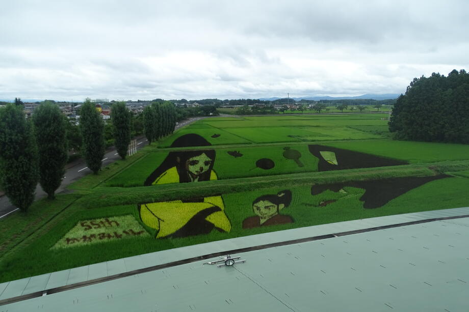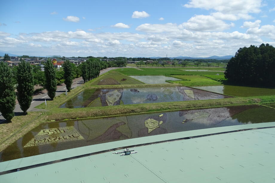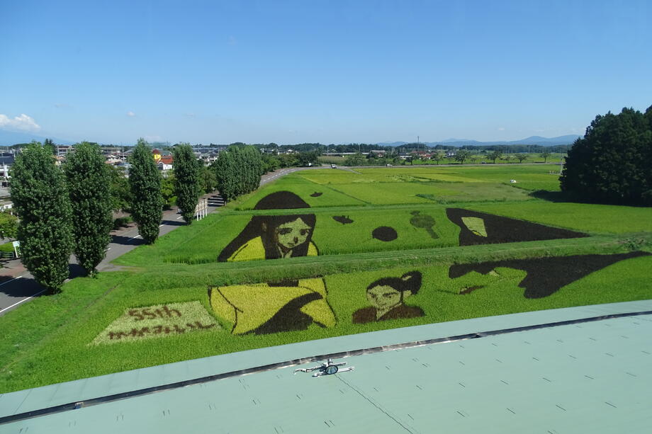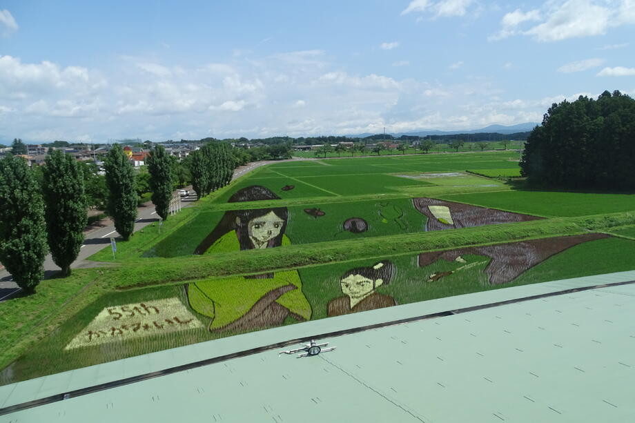 観覧場所から丁度よく見えるように遠近法を用いていることも、かがみいし田んぼアートの特徴です。