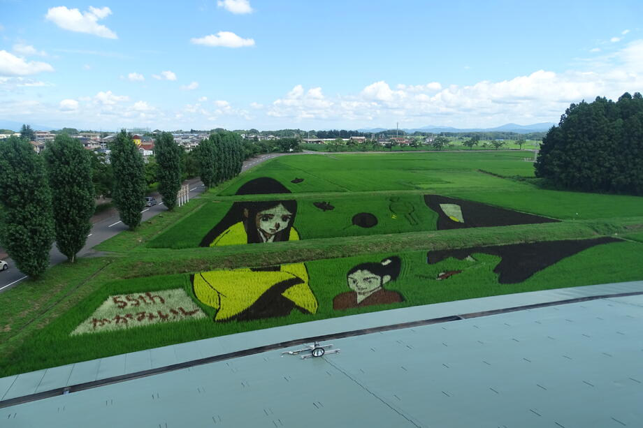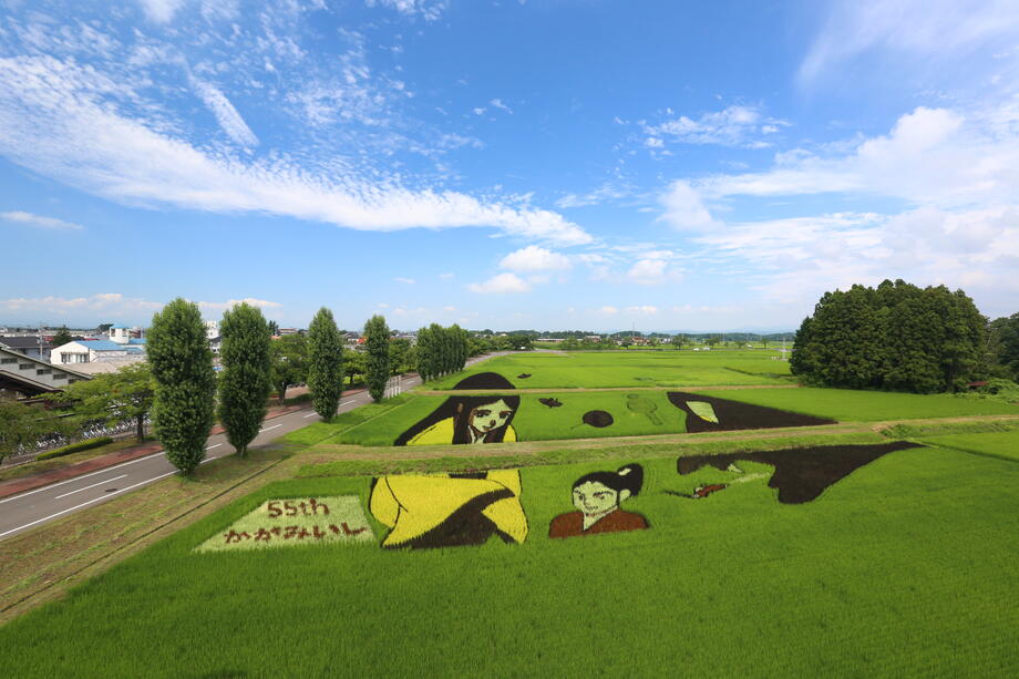 田んぼアートの見ごろは7月から8月です。小さな苗一つ一つが創り出す、大きな農の芸術「かがみいし田んぼアート」。今年も皆様のご来場をお待ちしております。