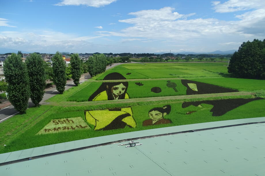 特に今年は町制施行55周年記念事業として、昨年まで約50アールだった圃場を約70アールに面積を拡大して制作しています。また「かがみいし55th」の文字を盛り込みました。