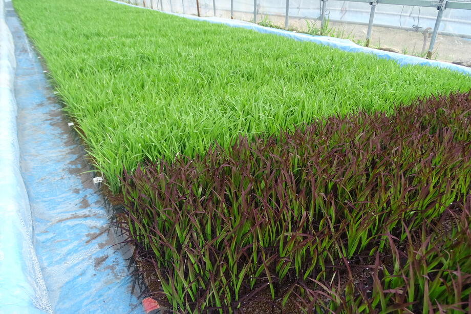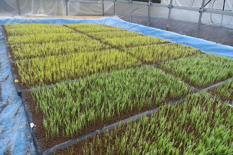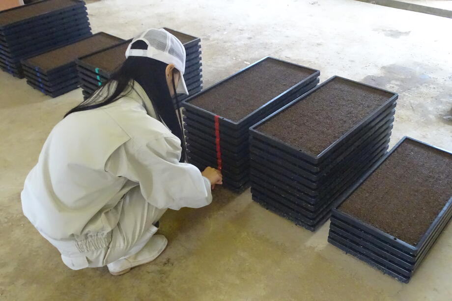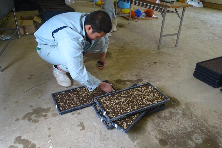 育苗箱全体に一定量の種が蒔かれていることがポイントですね。