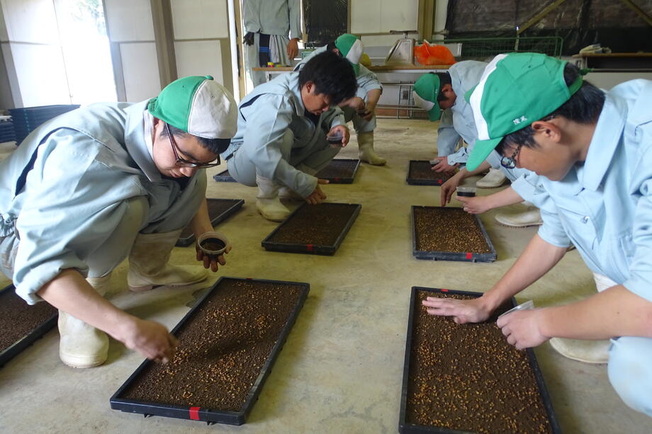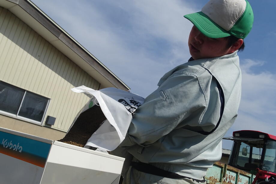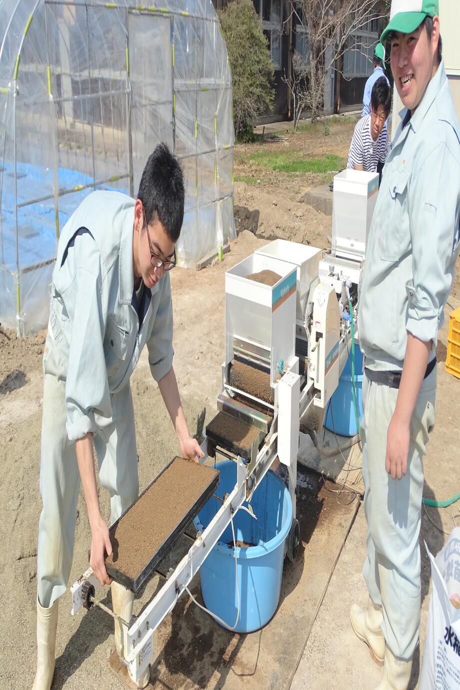 まずは、育苗箱に培土を入れる作業から始めます。力持ちな生徒の見せ場ですね。