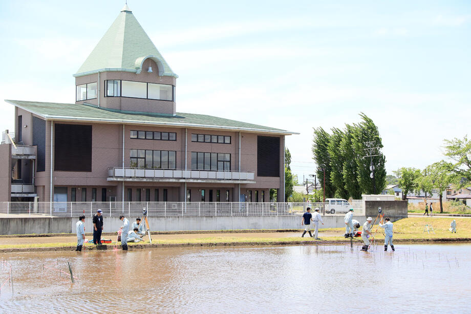 観覧場所の図書館4階が見えます。4階から観覧することを意識して距離感などを考えながら田植えします。