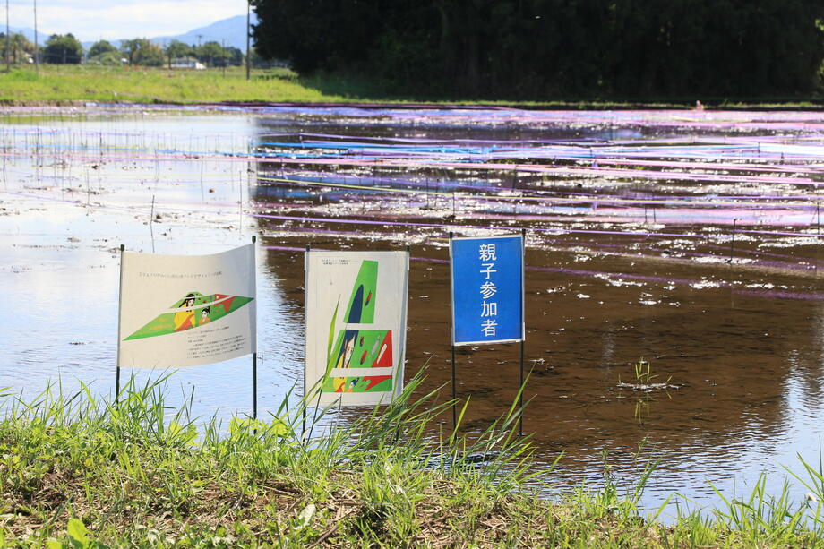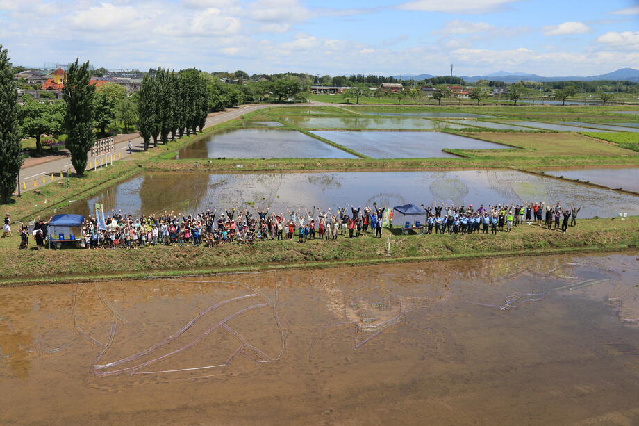 田植え祭りは、デザインを基に、参加者ごとに決められたエリアを田植えしていきます。