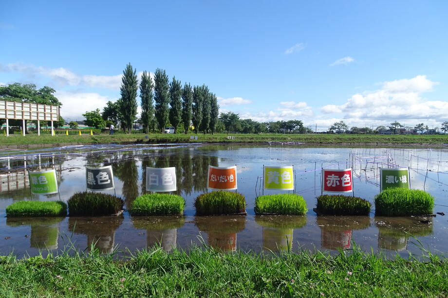 種まき、育苗、絵の下書きとなる測量作業、田植えと岩瀬農業高校の生物生産科作物専攻班と環境工学科測量専攻班に全面的な協力を得ています。昨年同様の6色7種類の苗を使用していますが、岩瀬農業高校の生物生産科のアイディアで白「ゆきあそび(観賞用稲)」と橙「あかねあそび(観賞用)」の苗を併せて植えることで新たに「ベージュ色」を作る試みもしています。なお、この苗は顔などの繊細な色合いを出すために用いられています。