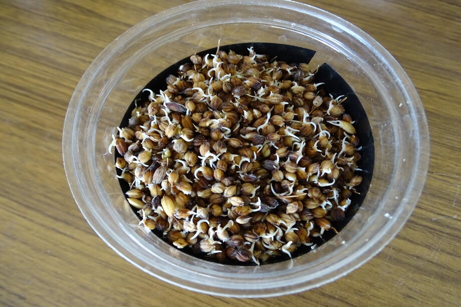 実際に蒔く種です。計量カップに目印を付け、一定量を蒔きます。