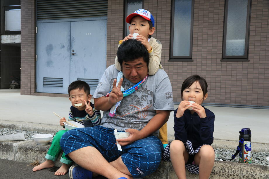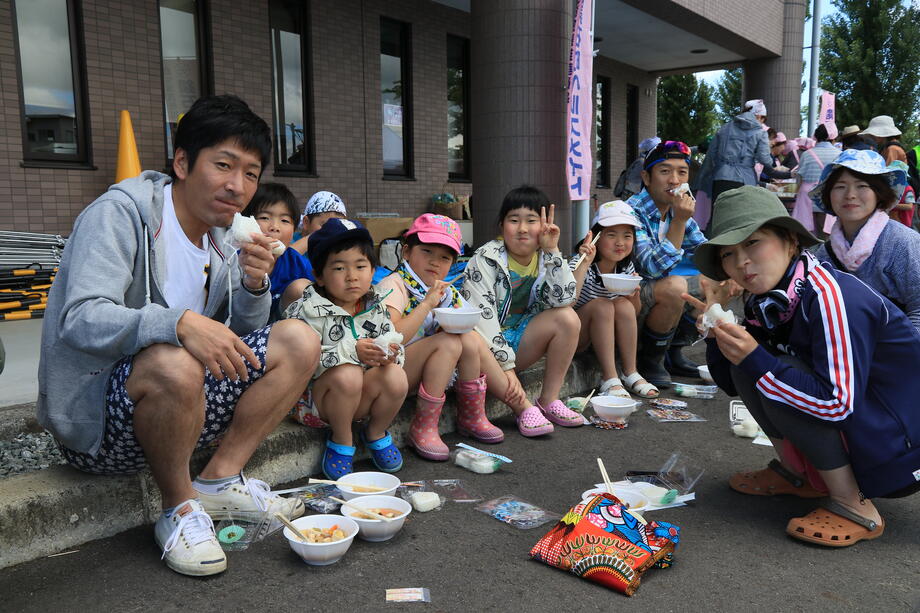 田植えの終了後は、田んぼアート米を使用した米粉すいとん入り豚汁を食べて疲れを癒します。