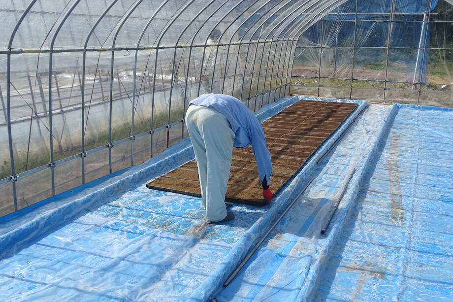 ビニールハウスの枠にしっかり並べていきます。この時には育苗箱もずっしりとして意外と重いんです。