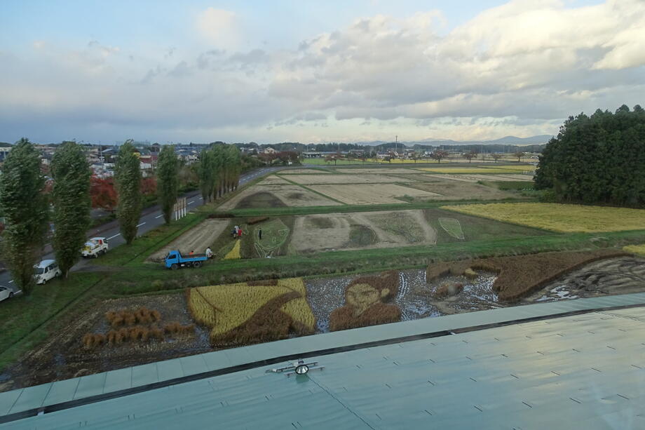 【10月17日撮影】稲刈りイベントが終了し、3D田んぼアートが完成しました。観覧者も初の3万人となりました!しかし、10月はずっと雨の日が続いております。(観覧者数 30,215名 10月17日現在)