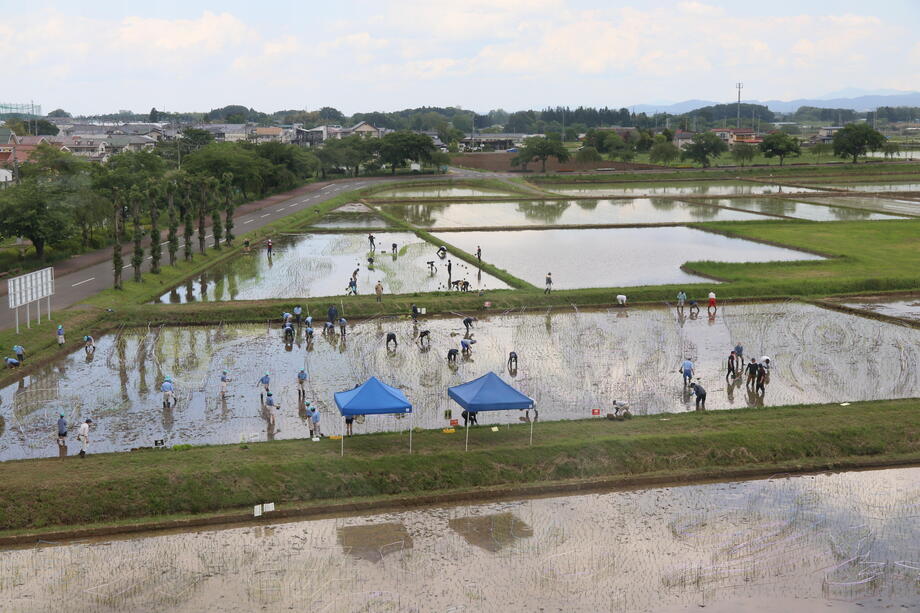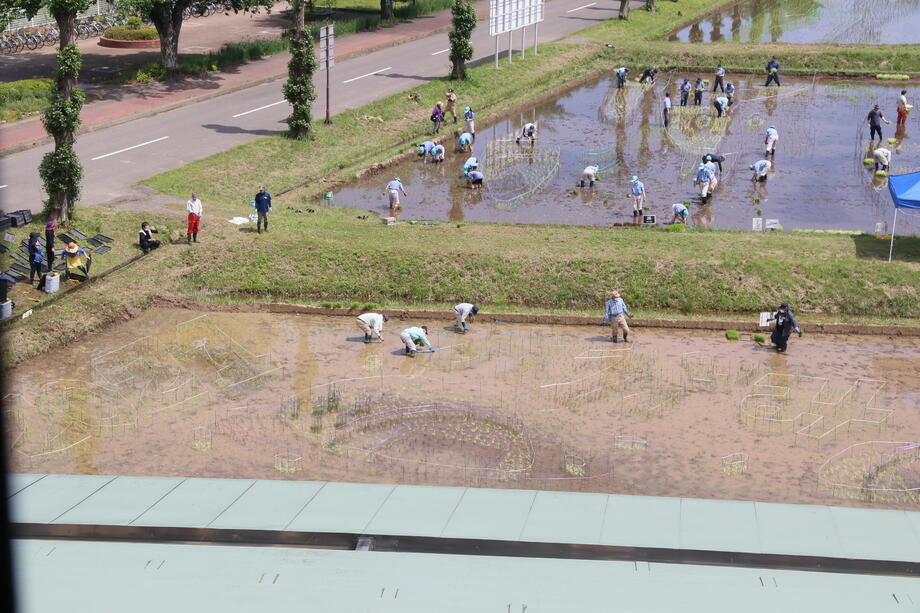 小さな苗一つ一つが作り出す、大きな農芸術「かがみいし田んぼアート」。